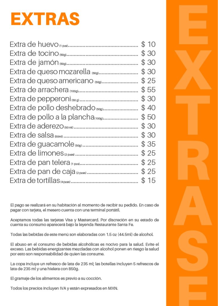 · MENÚ DE ALIMENTOS · Dentro del Hotel Sante Fe contamos con room service durante las 24 horas del día, en donde la variedad de nuestros menús pueden satisfacer algo más que un antojo. · MENÚ DE BEBIDAS ·