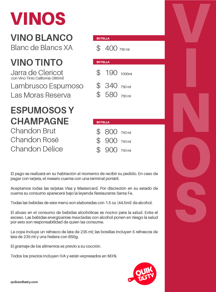 Dentro del Hotel Sante Fe contamos con room service durante las 24 horas del día, en donde la variedad de nuestros menús pueden satisfacer algo más que un antojo.
